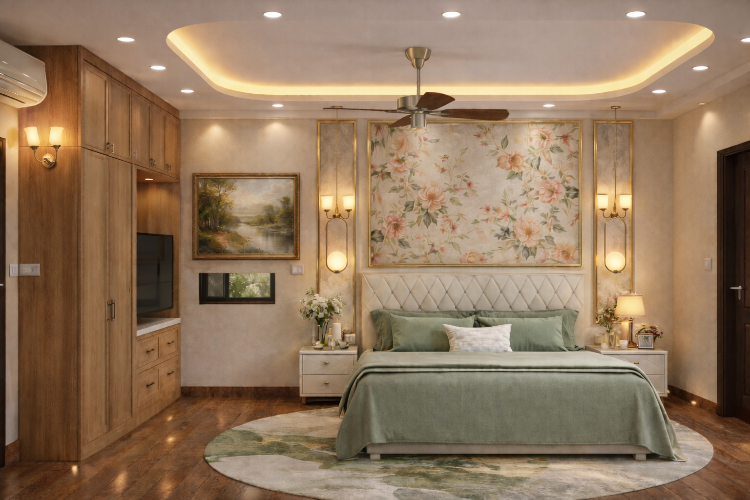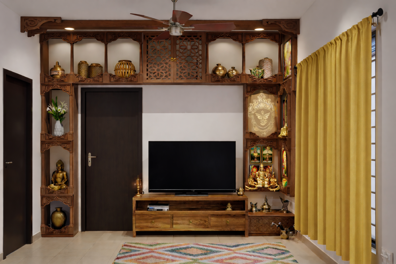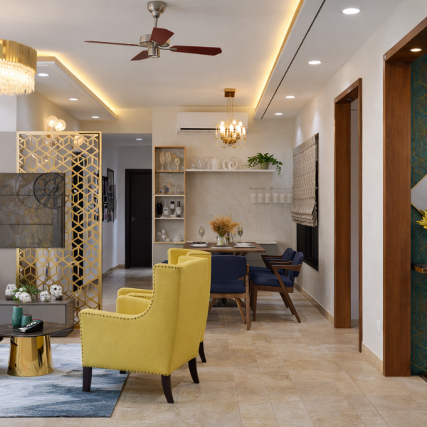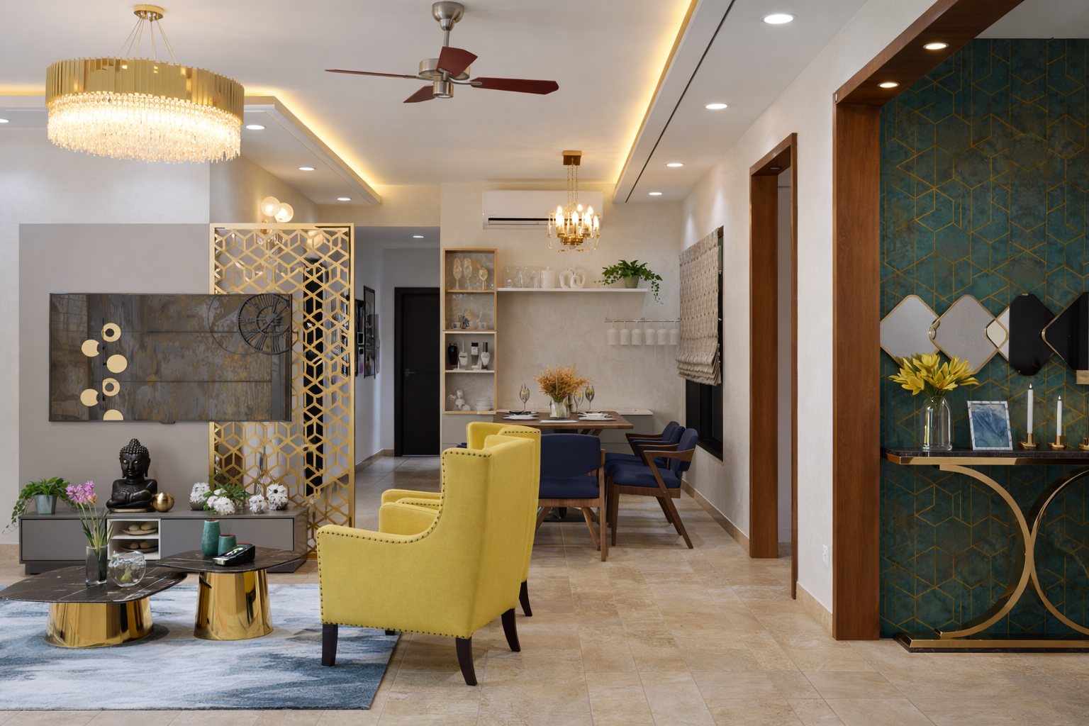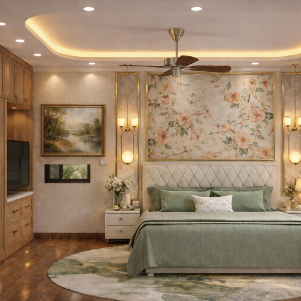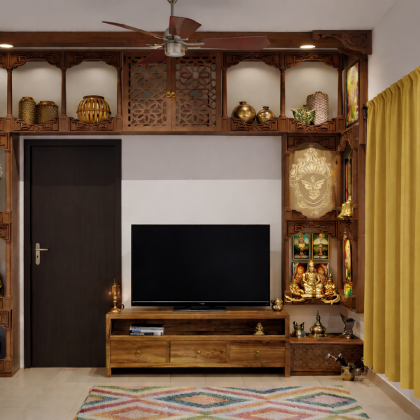 Designed for a Bengali family deeply connected to art, culture, and heritage, the interiors balance traditional charm with modern living. Intricate jharokhas, curated handicraft displays, and a serene Mandir honoring Maa Durga bring heritage to life, while contemporary elements ensure comfort and convenience for every generation.