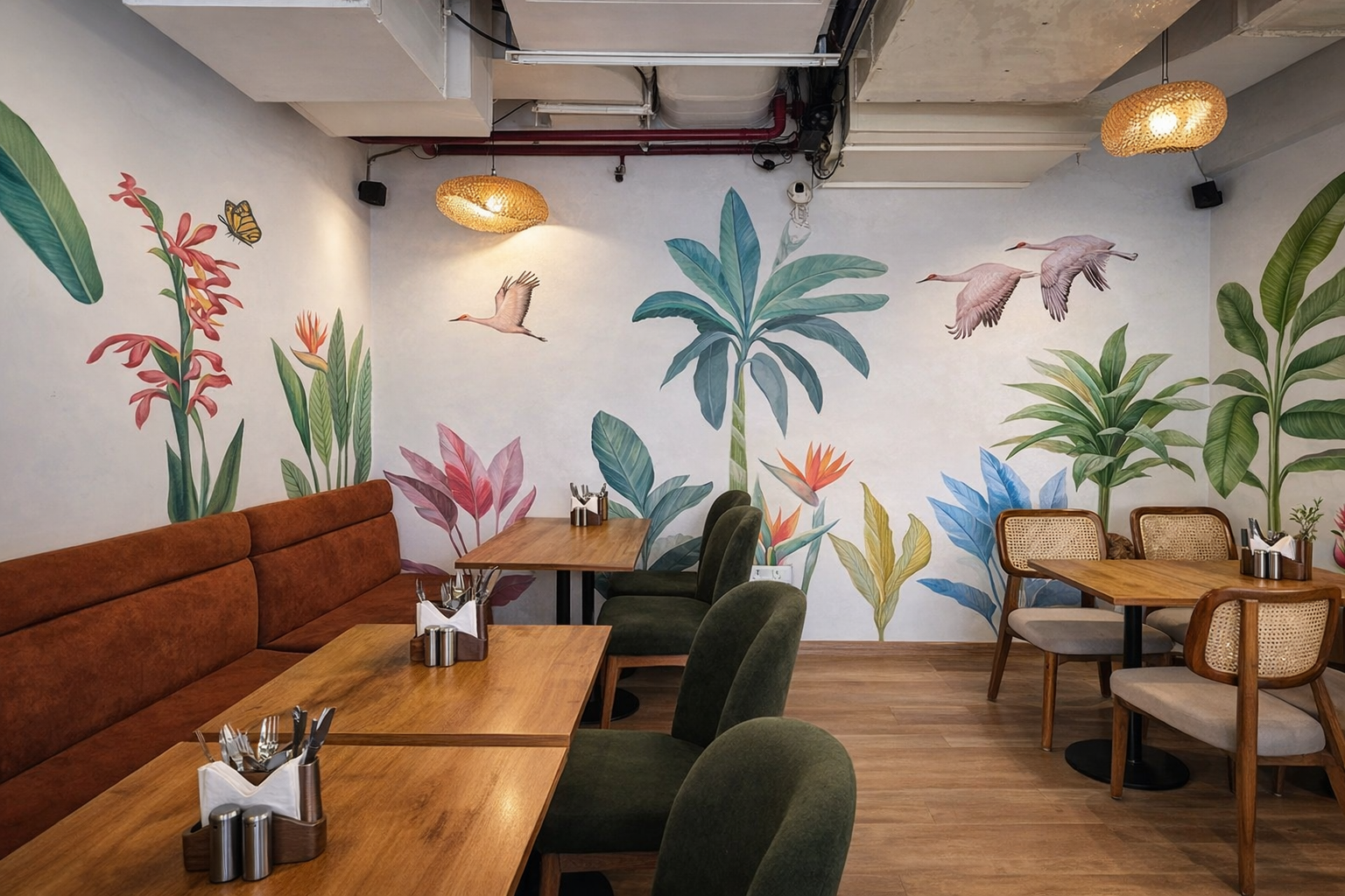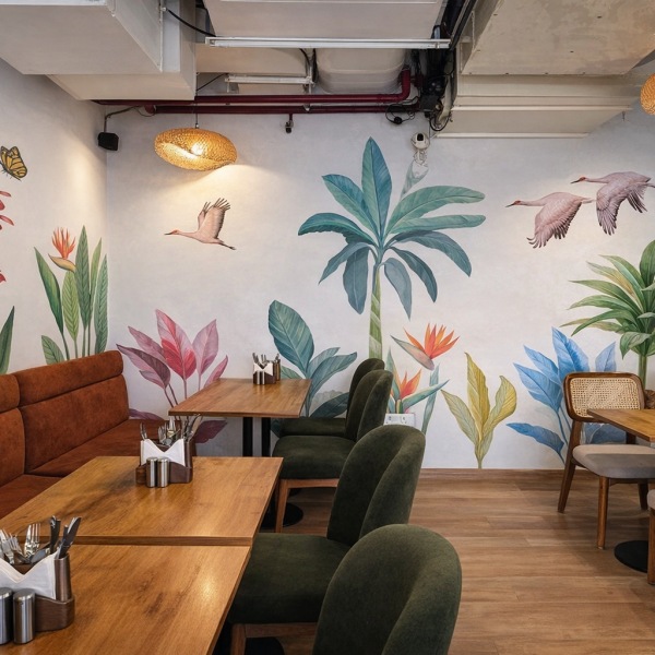 Guests are welcomed by handcrafted walls featuring birds soaring through dreamy clouds ( symbols of freedom, wanderlust, and imagination). As you move through the space, a lush, hand-painted tropical forest unfolds, seamlessly bringing the outdoors in.