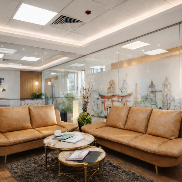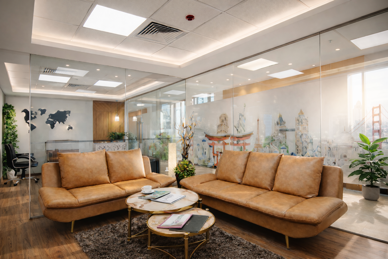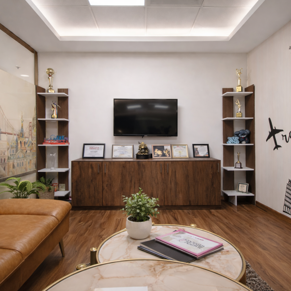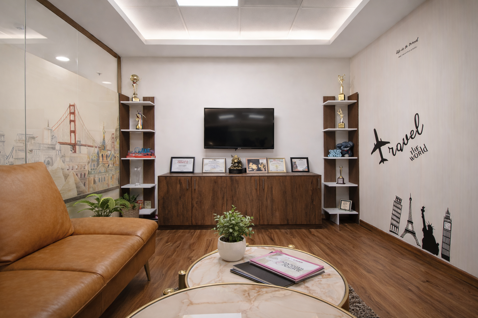 This 850 sft  contemporary travel agency office at M3M Urbana, Gurgaon blends structured luxury with warm hospitality. Clean layouts, refined materials, and well-defined zones support seamless client interactions, while thoughtful experiential detailing and layered lighting create a professional yet inviting, globally inspired environment.