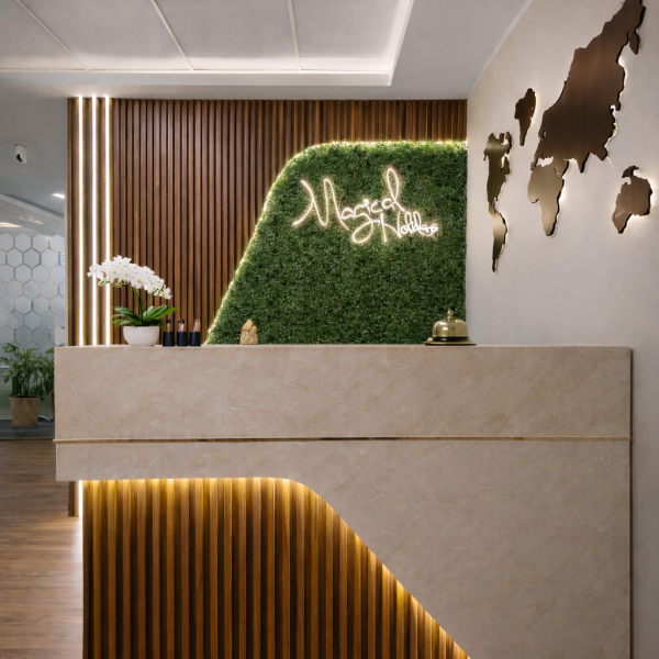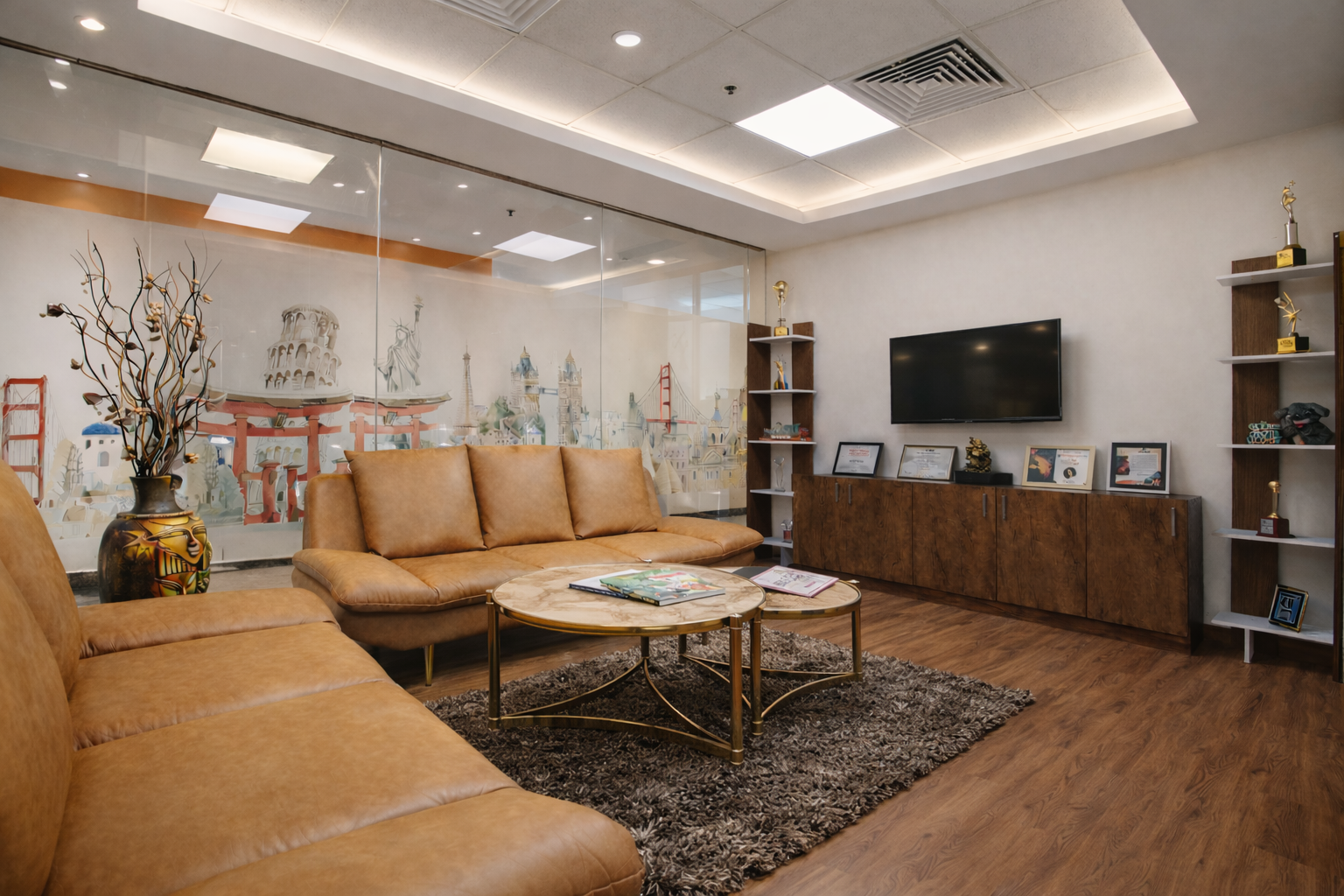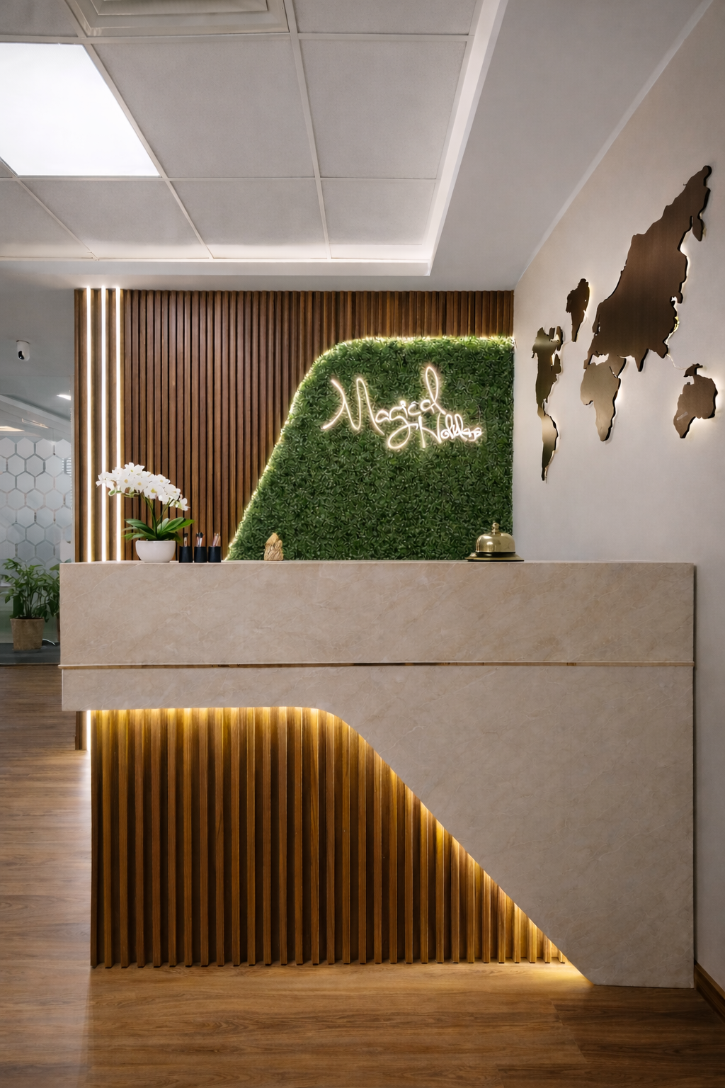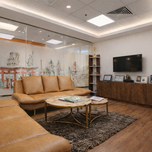 This 850 sft  contemporary travel agency office at M3M Urbana, Gurgaon blends structured luxury with warm hospitality. Clean layouts, refined materials, and well-defined zones support seamless client interactions, while thoughtful experiential detailing and layered lighting create a professional yet inviting, globally inspired environment.