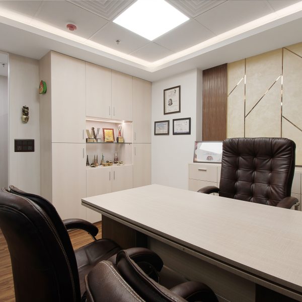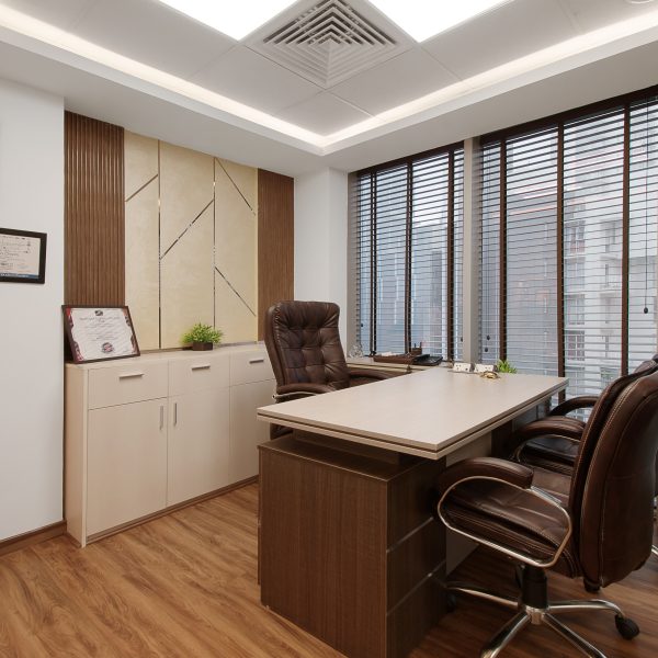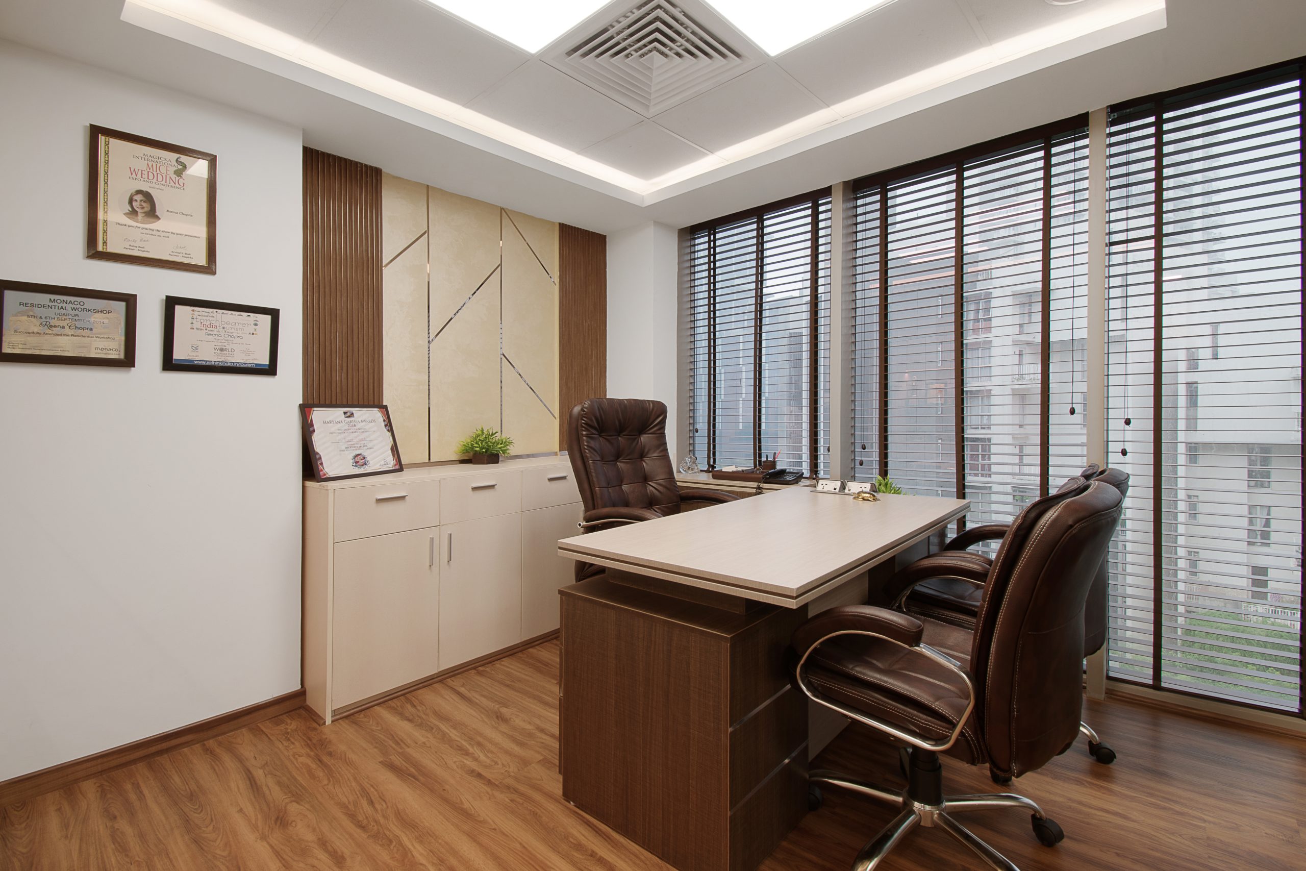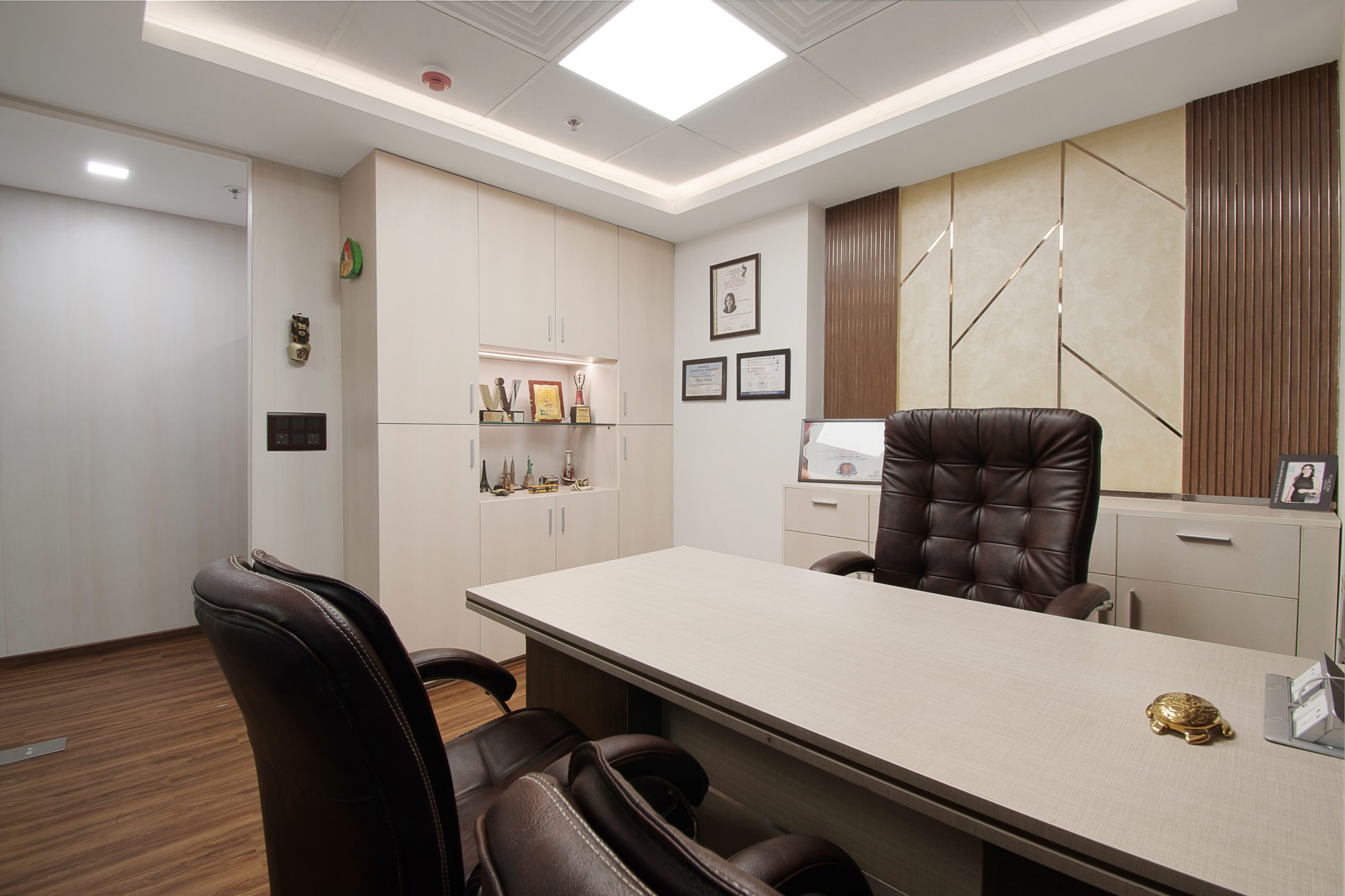 It has a warm reception, a lounge, 2 MD Cabins, workstations and a pantry.